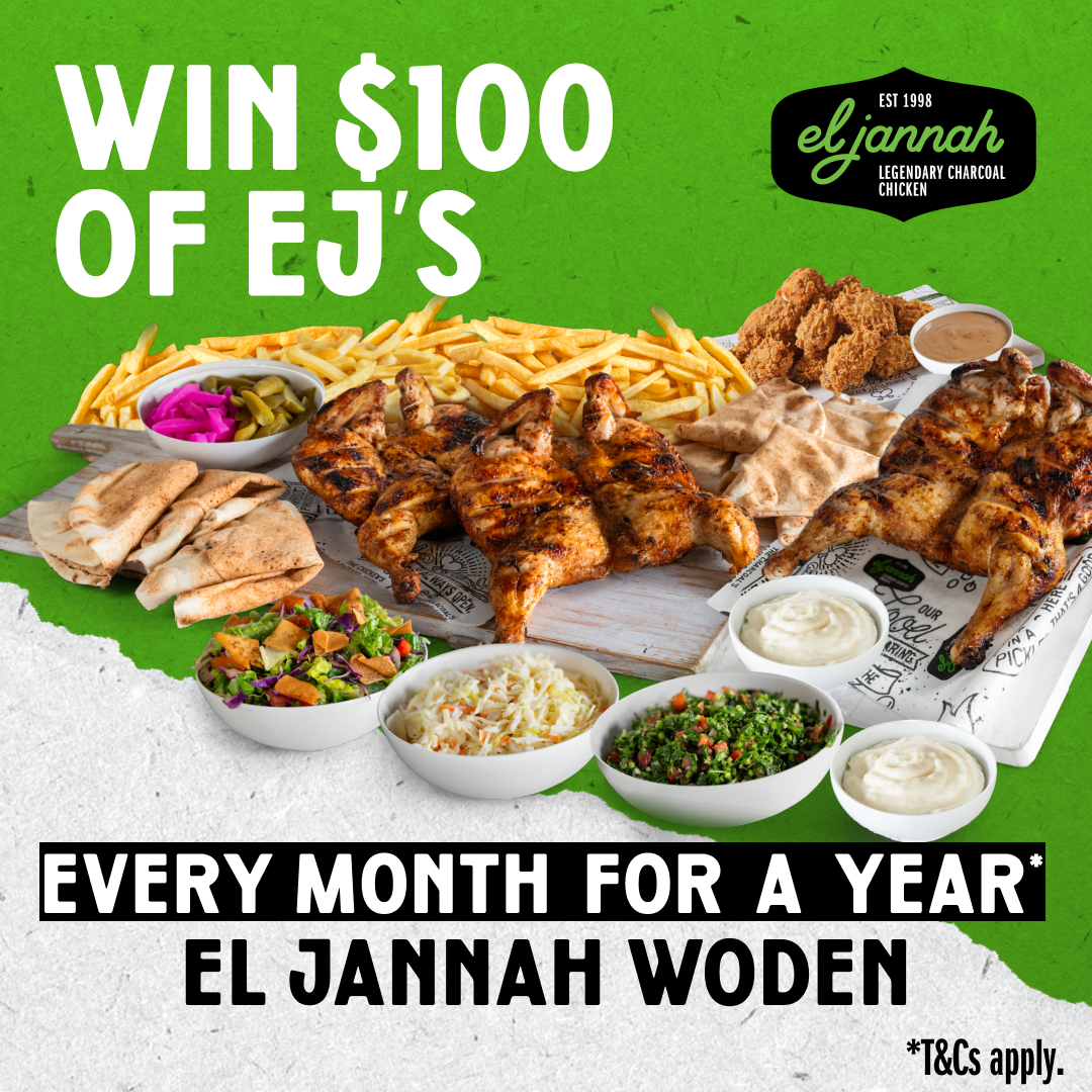 Win El Jannah for a whole year! Enter our Eat Free For A Year competition and enjoy $100 worth of El Jannah every month for 12 months. Whether you’re craving charcoal chicken, garlic sauce, or your favourite wraps, this is your chance to feast for free. Open to new and existing customers across ACT because you really deserve it. T&Cs apply.
